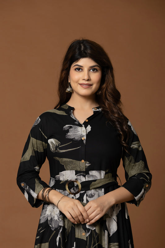 Midnight Bloom Black Floral Print Belted Dress