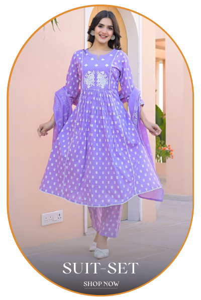 Who said fashion means settling your pallu all day? You can embrace the beauty of our culture without sacrificing style or comfort with The Suit Set Collection from Anusheet Fashion. We embrace the beauty of classic suit sets for women of all ages. We offer a diverse collection, including simple designs for daily wear and more ornate and embroidered suit sets for festive celebrations. The salwar kameez sets offer comfort with breathable fabrics like cotton, silk and chiffon.