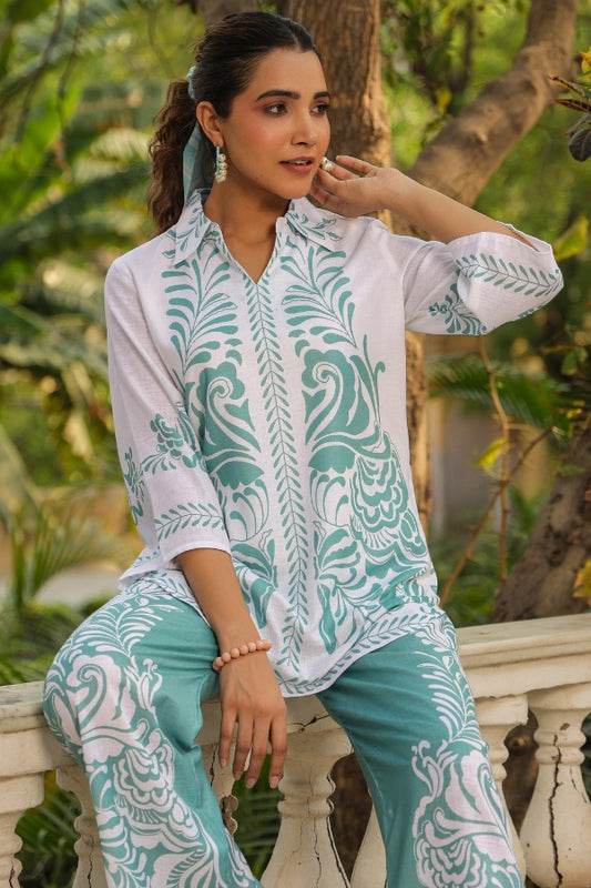 Light Green & White Ethnic Print Co-Ord Set for Women