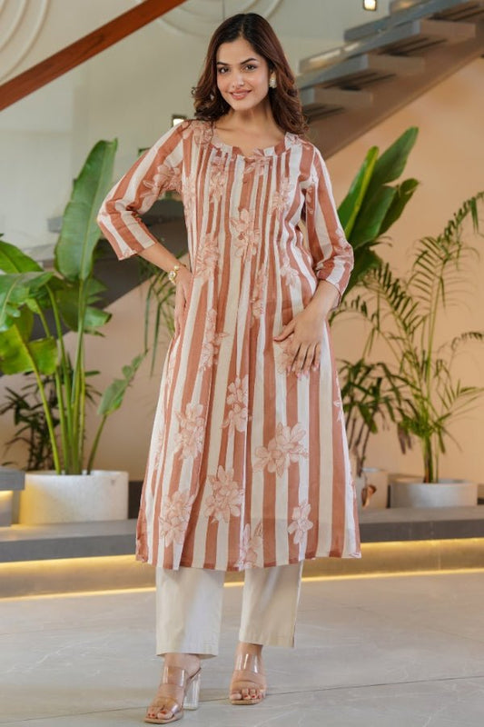 Rust Striped & Floral Flared Kurti with Trouser Set 2 Piece Summer Outfit