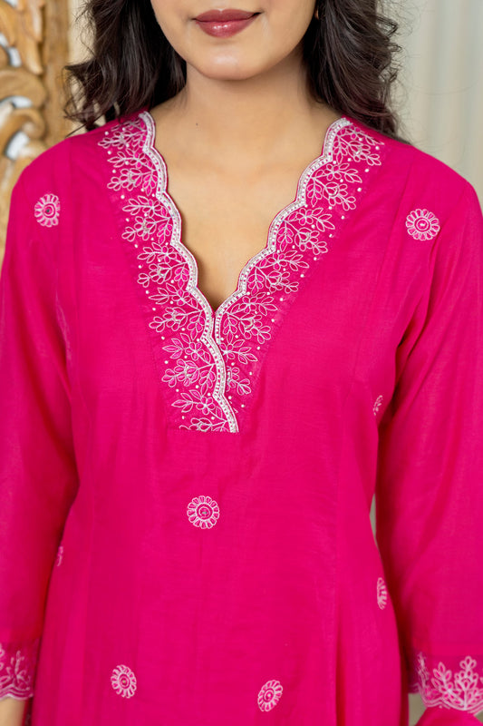 Fuchsia Embroidered Kurta Set with Palazzo & Dupatta