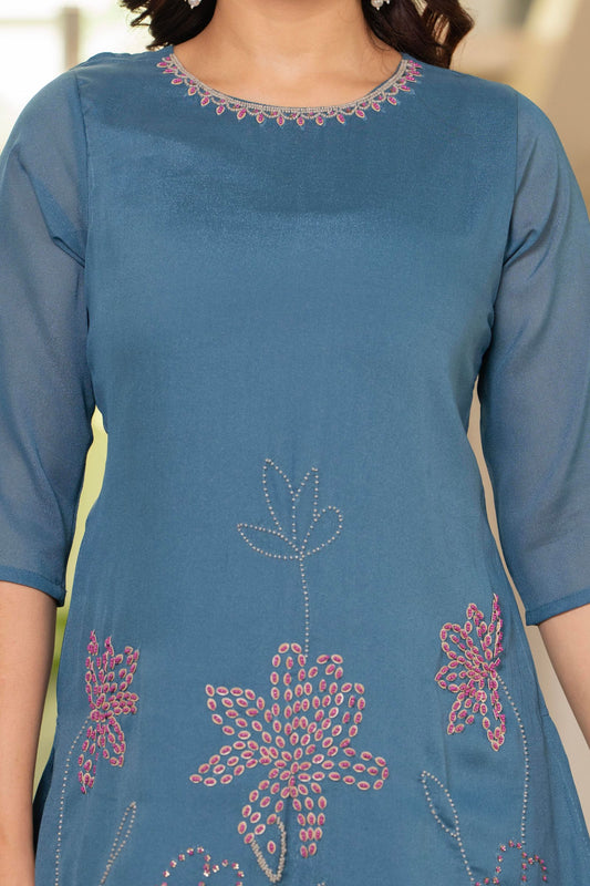 💠 Teal Bloom: Hand-Embroidered Floral Kurta Set 💠