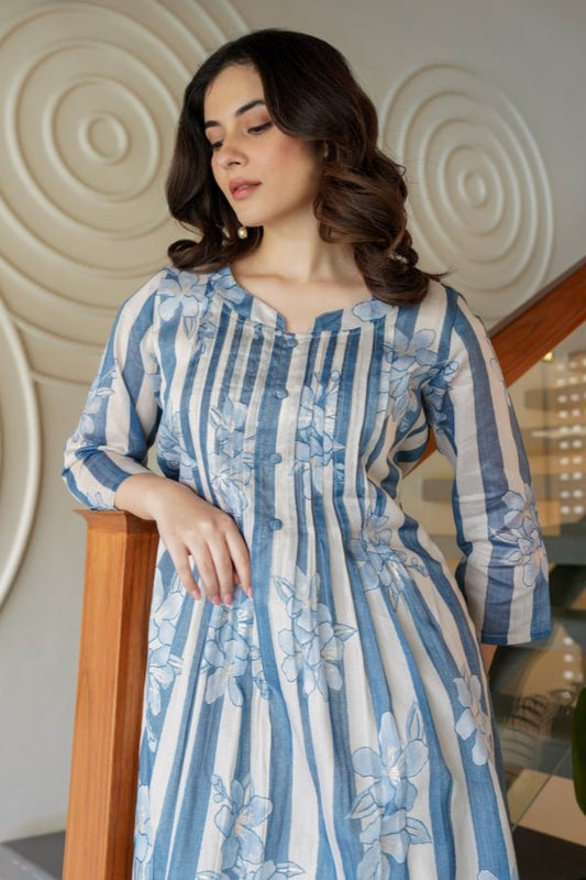 Varalaxmi Blue Striped and Floral Flared Kurti with Trouser Set