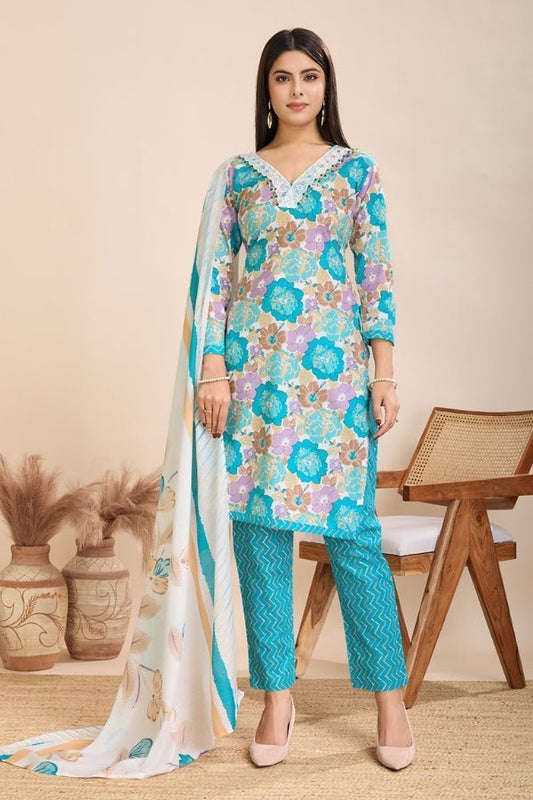 Rolex Blue Printed V Neck Salwar Suit Set with Dupatta