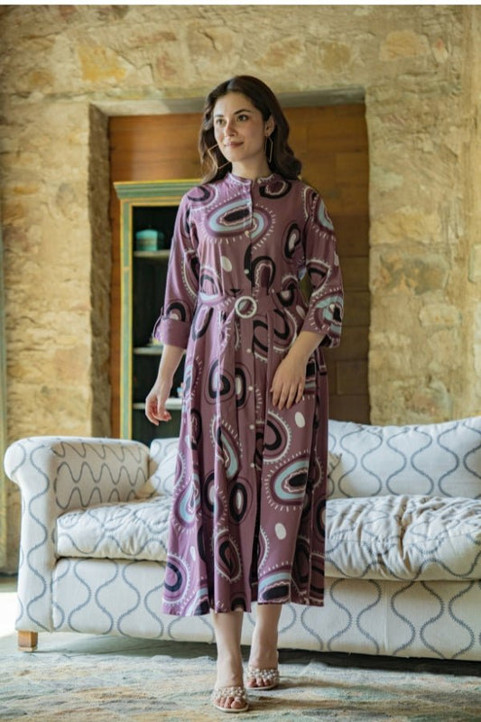 Pink Abstract Printed Pure Rayon Midi Dress with Stand Collar