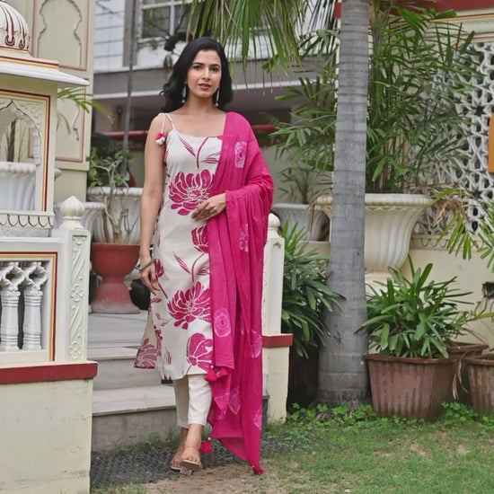 Complete with matching off-white pants and a vibrant pink dupatta with tassel accents, this set is perfect for festive occasions, parties, or traditional gatherings.