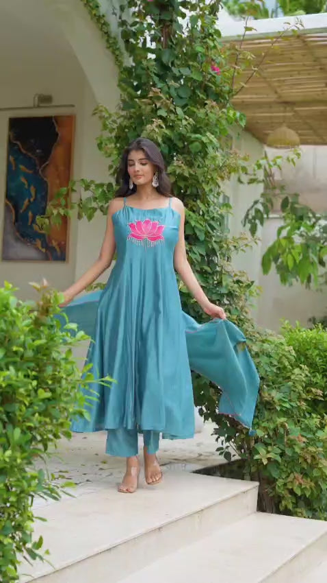 Teal blue Anarkali co-ord set, featuring a stunning pink lotus embroidery on the front. Symbolizing purity and grace, the lotus design adds a spiritual and artistic charm to this breezy ensemble. Designed with a sleeveless cut, flared silhouette, and matching pants, this outfit blends ease and sophistication for every occasion.
