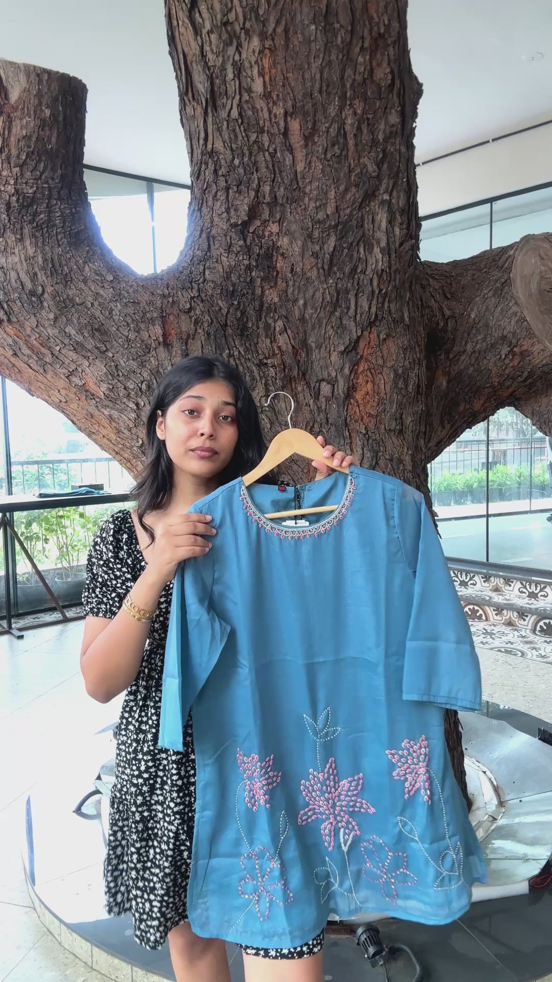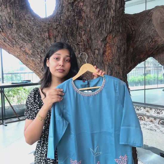 This beautiful blue kurta set brings together elegance and comfort. The soft, breathable fabric ensures a relaxed fit, while the delicate floral embroidery adds a touch of sophistication.