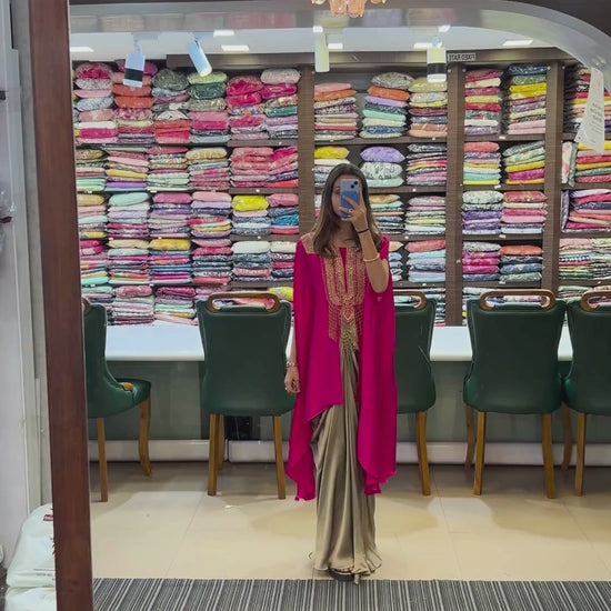 Black Cape Style Embellished Top & Golden Drape Skirt Set, crafted to bring unmatched grace and luxury to every celebration.
