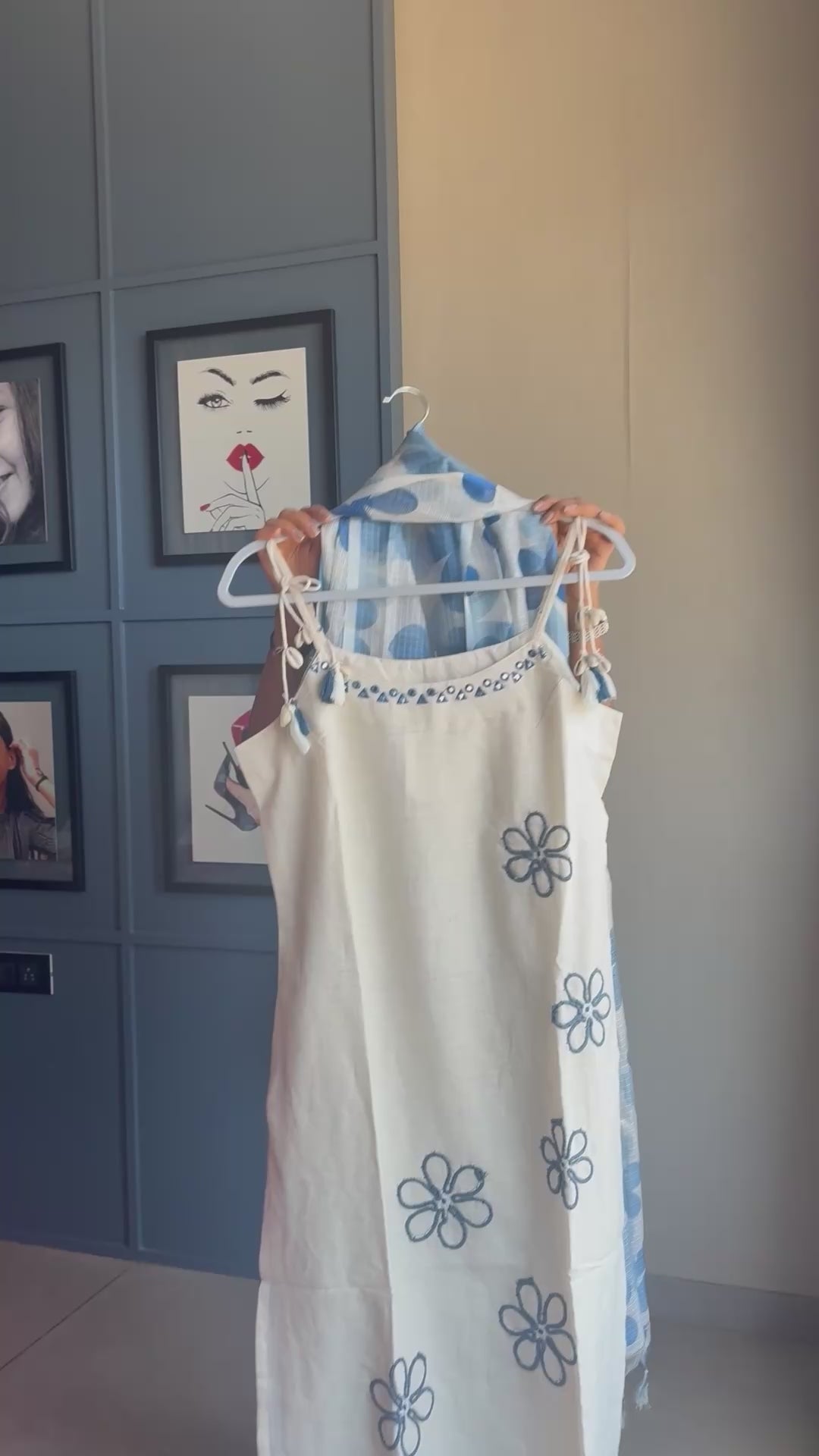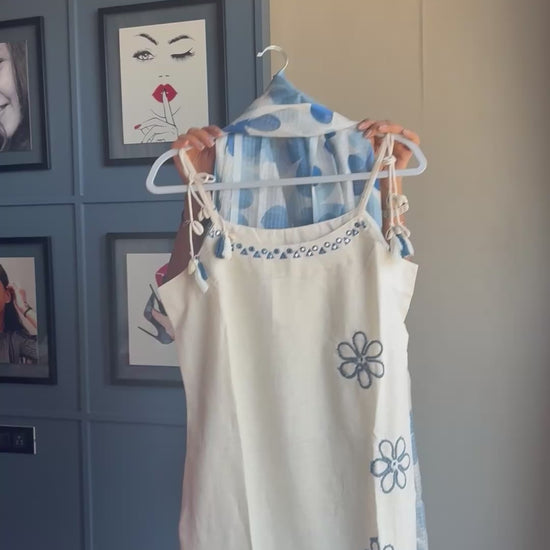Channel fresh elegance with this dreamy Blue Bloom Suit Set β a stunning blend of soft ivory and cool blue tones! πΏ The sleeveless kurta features delicate navy floral embroidery, while the airy dupatta boasts oversized blue floral prints that bring a refreshing splash of charm. π Paired with comfy straight pants detailed with coordinating embroidery at the hem, this outfit is all about easy grace and effortless beauty.