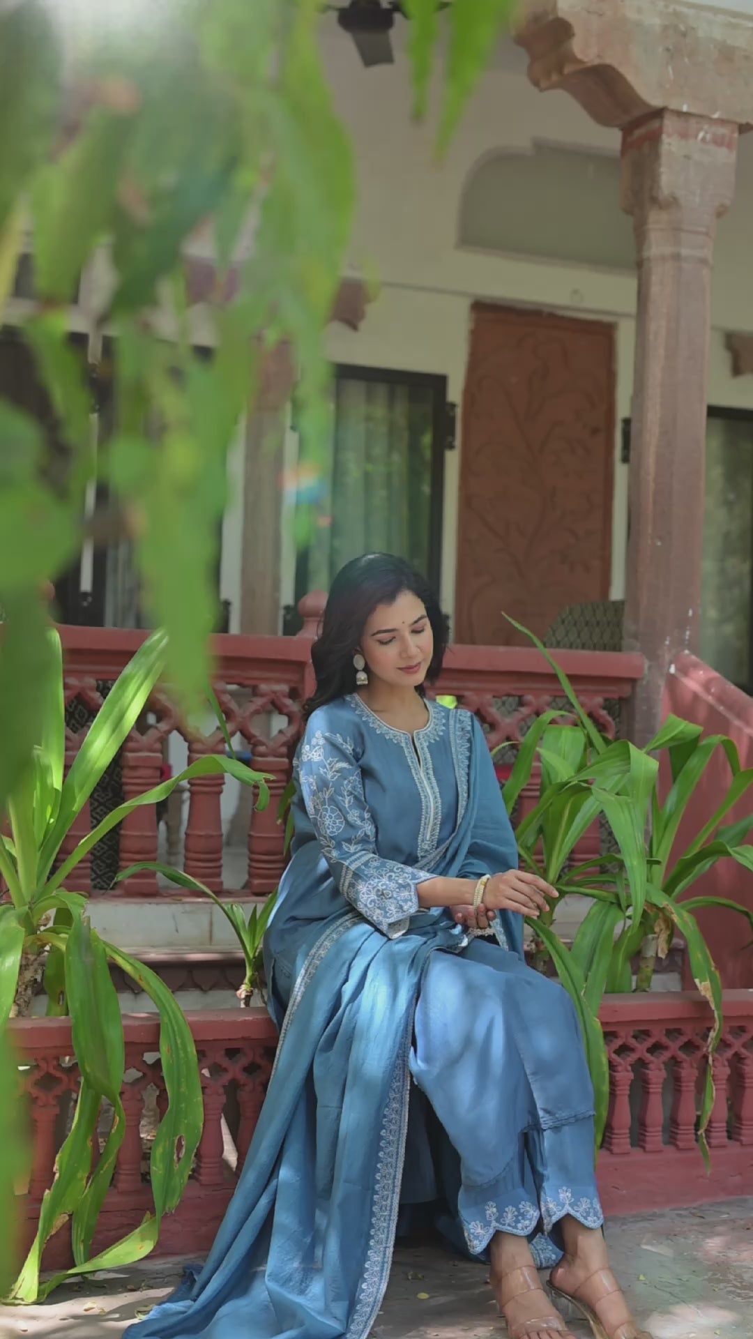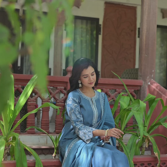 Blue Cotton Anarkali Kurta Set With Dupatta| Embroidered Sleeves, Neck |Anarkali style Wear