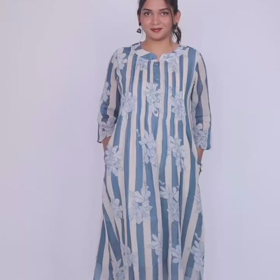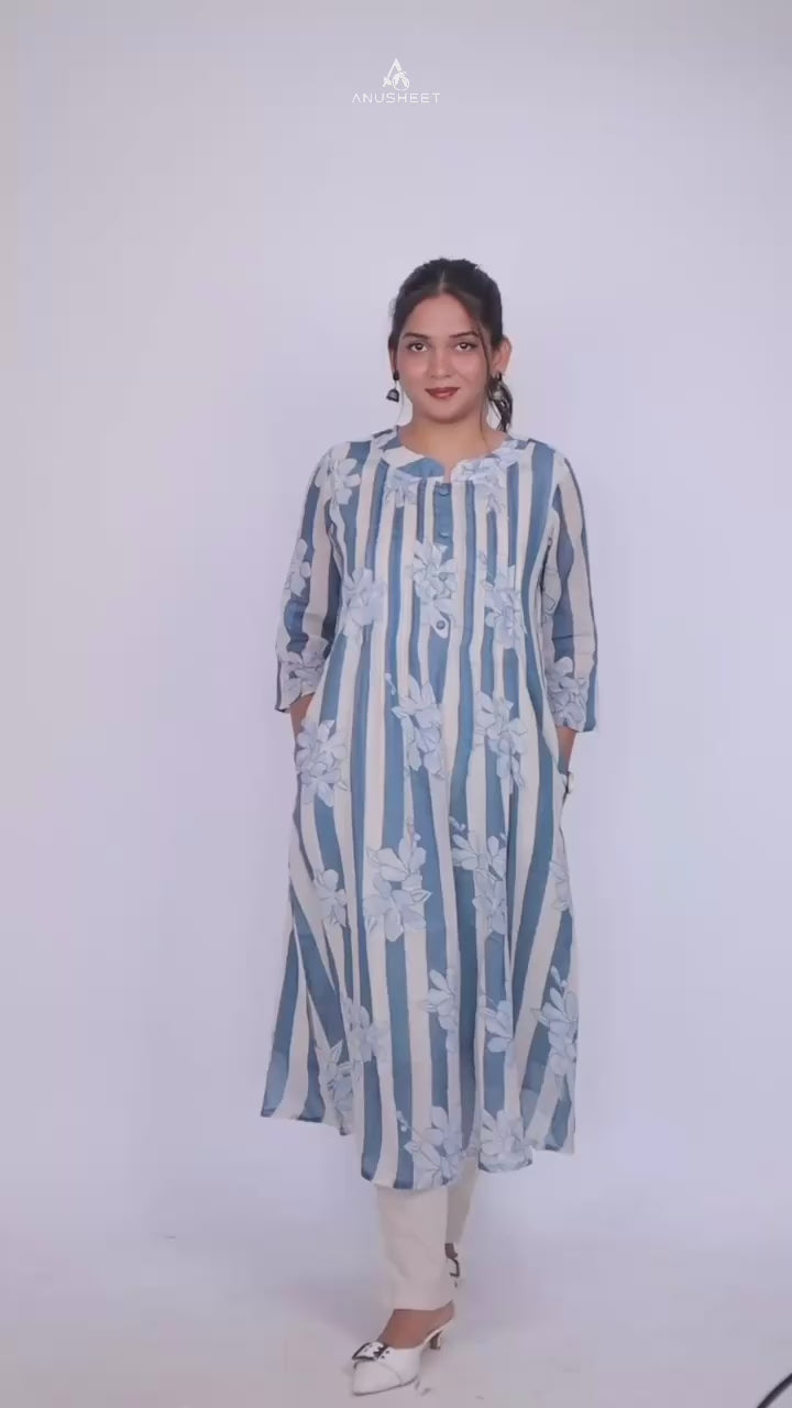 Upgrade your summer fashion with this elegant 2-piece flared kurti and trouser set, featuring a refreshing blue and white striped base with delicate floral accents. Designed for comfort and style, the lightweight fabric ensures breathability, keeping you cool throughout the day. The flowy silhouette of the kurti paired with straight-fit trousers makes this set perfect for casual outings, festive gatherings, or daily wear.