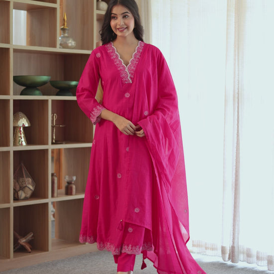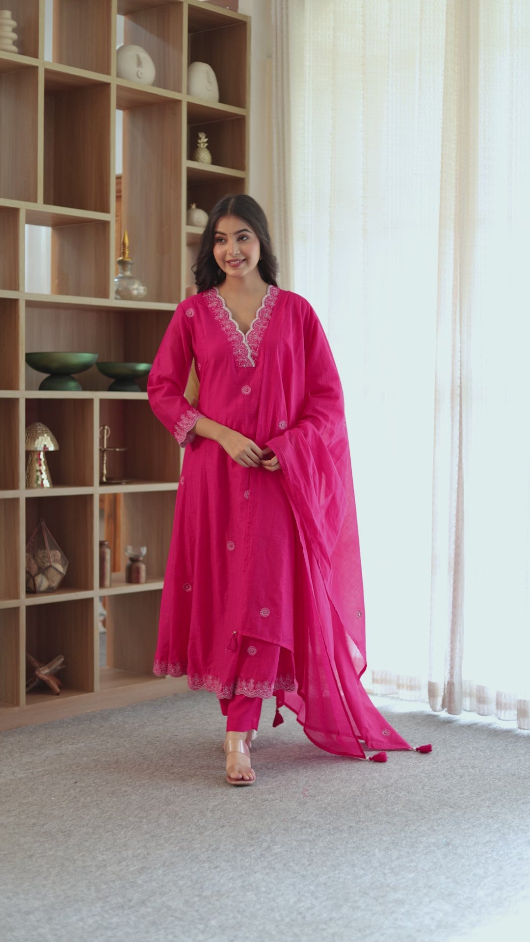 Vibrant fuchsia kurta set. Featuring delicate floral embroidery and a flattering V-neckline, this outfit exudes elegance and comfort. The breezy kurta is paired with a matching palazzo for a modern twist on traditional style.