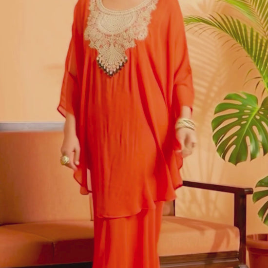 The Kaftan Top is the centerpiece, offering a relaxed and universal fit that drapes beautifully over any body type. Paired with the dramatically Flared Sharara Bottom, the ensemble creates a striking, voluminous silhouette.
