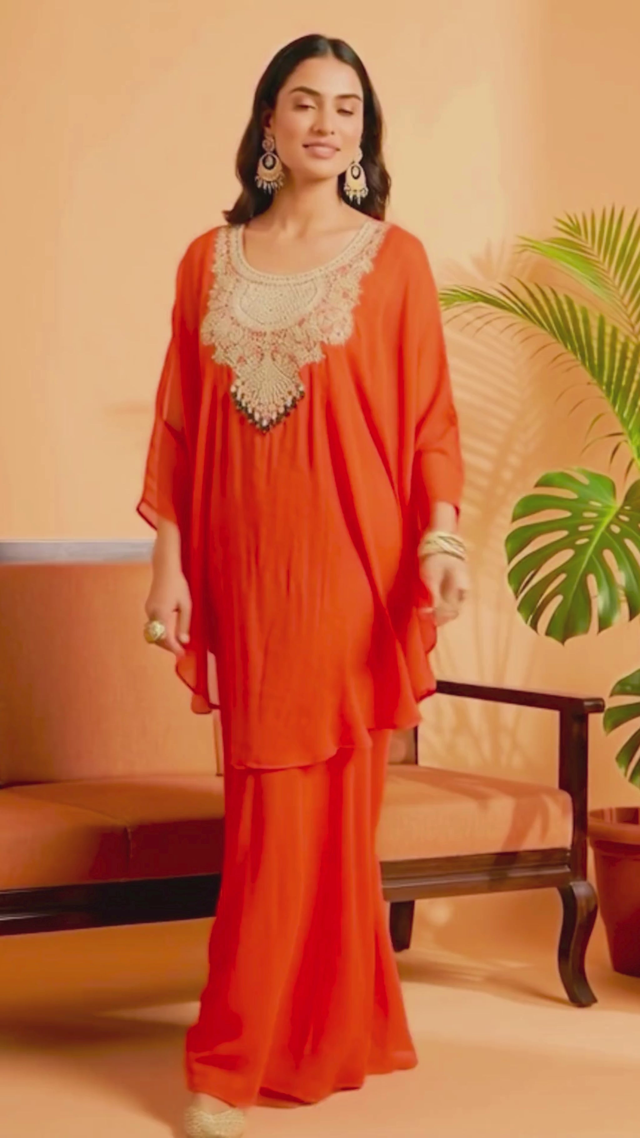 - Chic Kaftan Silhouette: Features the trendy Kaftan Style Top, known for its loose, flattering fit and effortless elegance, from the exclusive Meena Shorey collection.
