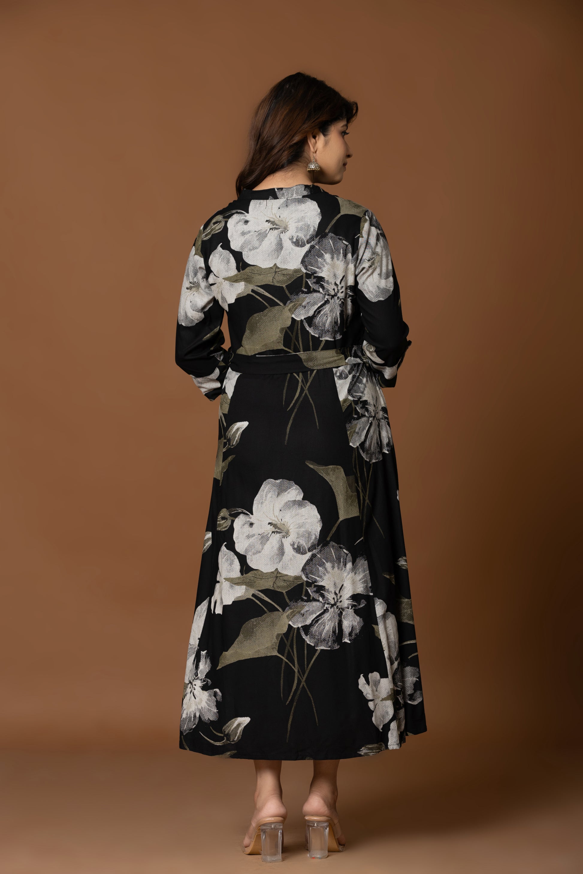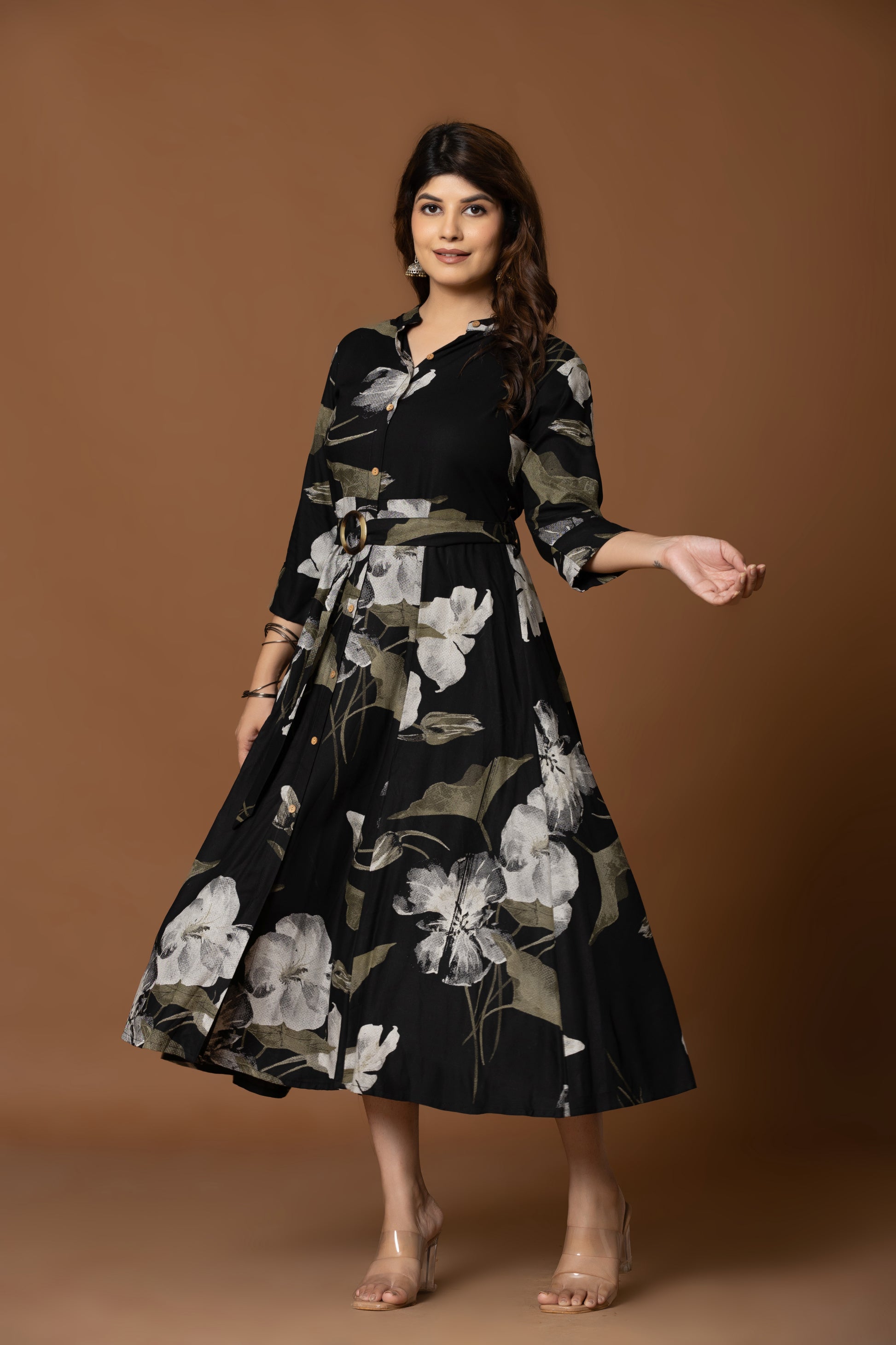 Midnight Bloom Belted Shirt Dress – Floral Elegance in Black