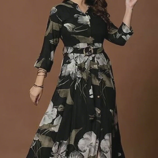 Midnight Bloom Belted Shirt Dress – a masterpiece that blends structure with softness. Designed for women who love timeless florals and flattering fits, this midi-length shirt dress features a button-down front, elegant 3/4th sleeves, and a cinched waist with a sleek fabric belt.