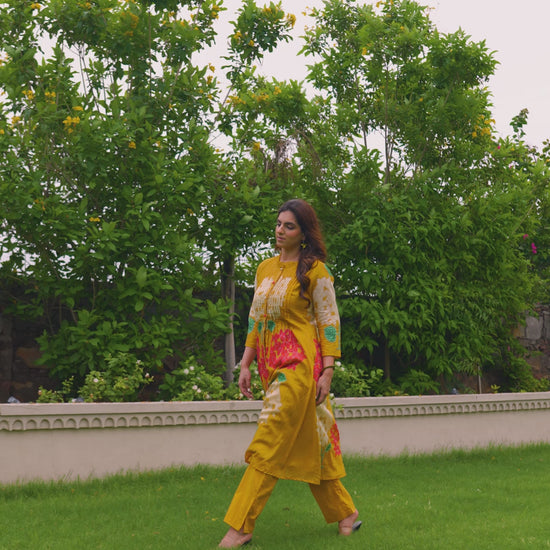 Mustard Yellow Floral Embroidered Kurta Set with Straight Pants | Festive & Casual Wear