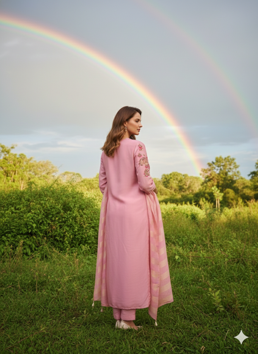Rainbow Muslin Indo Suit Set Neck Hand-Work Floral