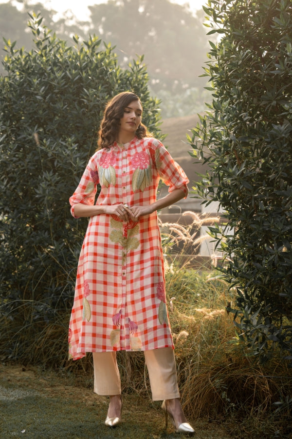 Red Checkered Floral Print A-Line Kurti with Beige Pants Set
