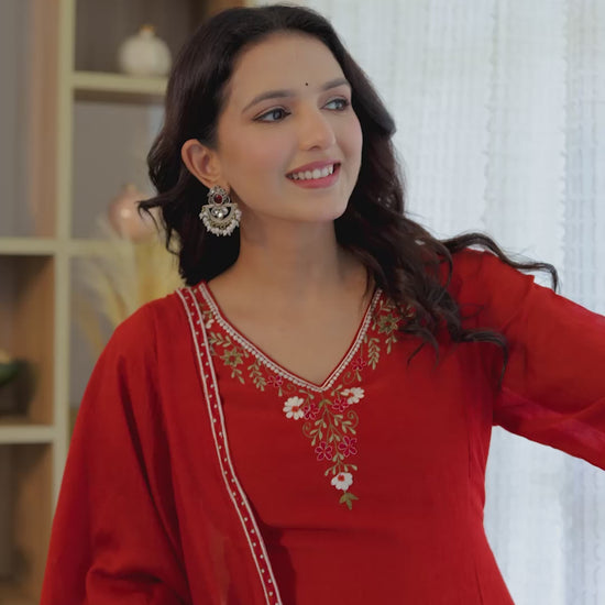 Red Kurta Set with Dupatta | Embroidered floral motifs, tassel detailing | Festive Ethnic Wear👗