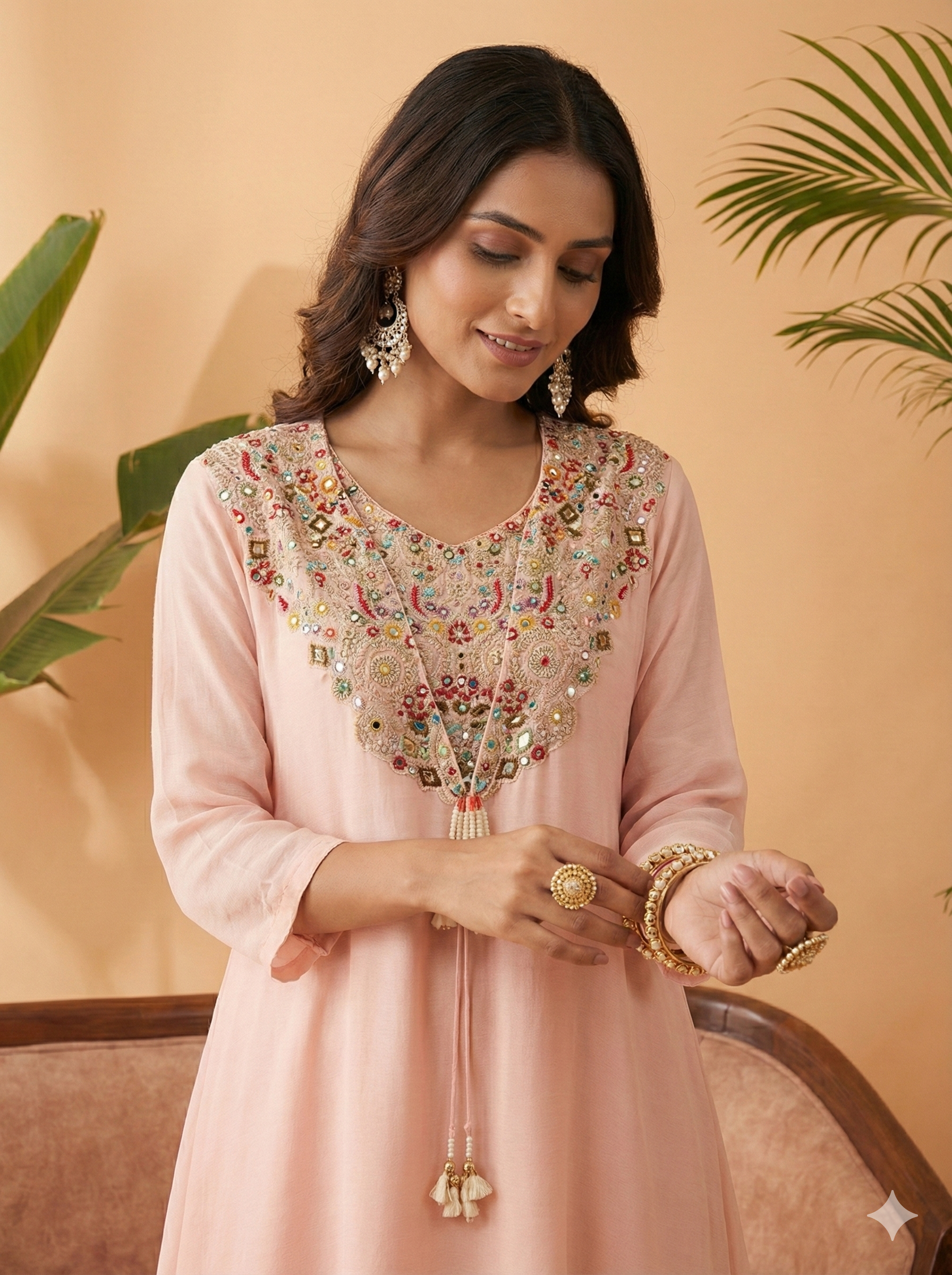 - Design: Detailed embroidery and refined Indo Western styling