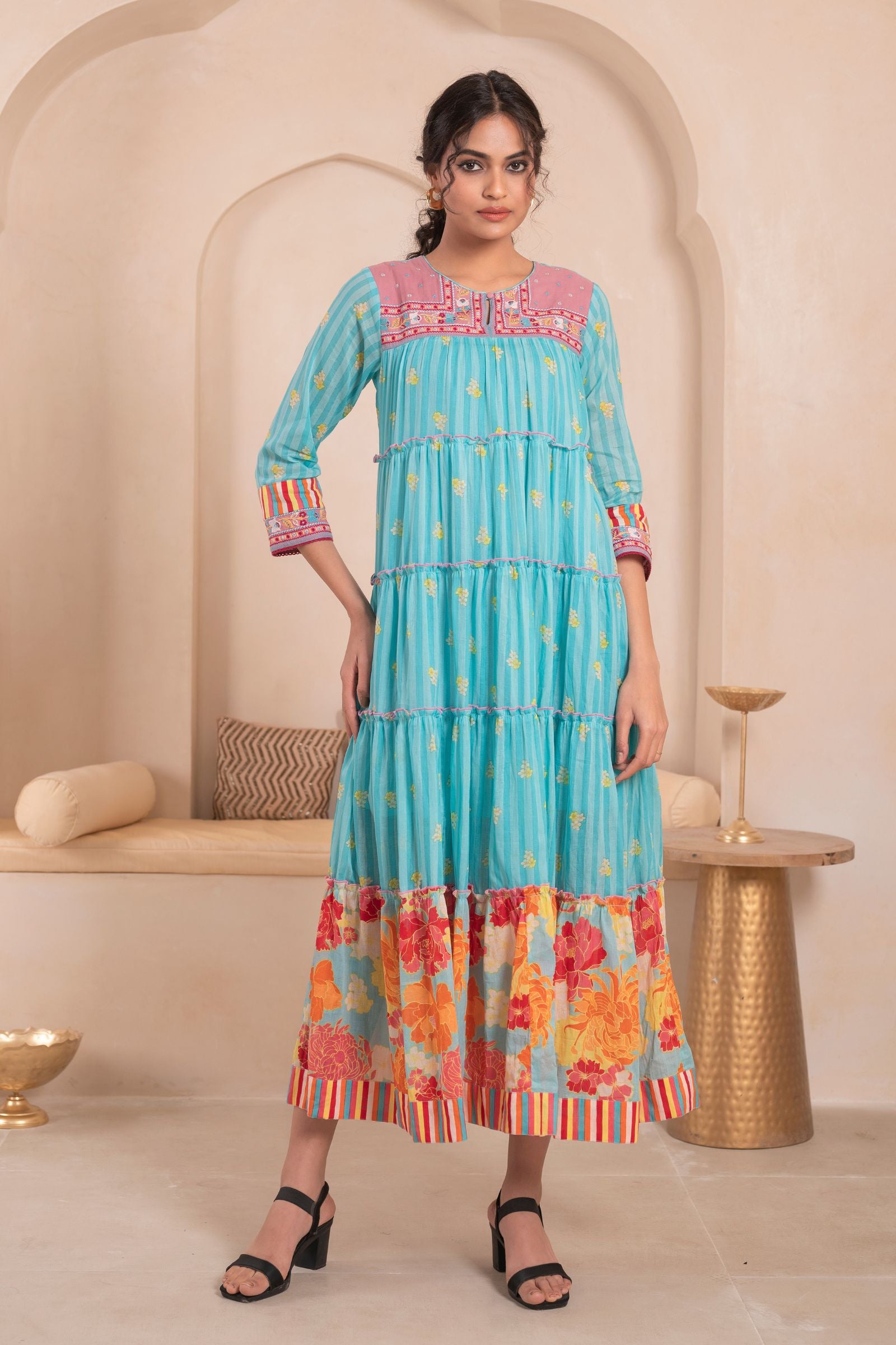 Women’s Cotton Blue Floral Embroidered Fit and Flare Dress – Elegant Casual and Party Wear Outfit
