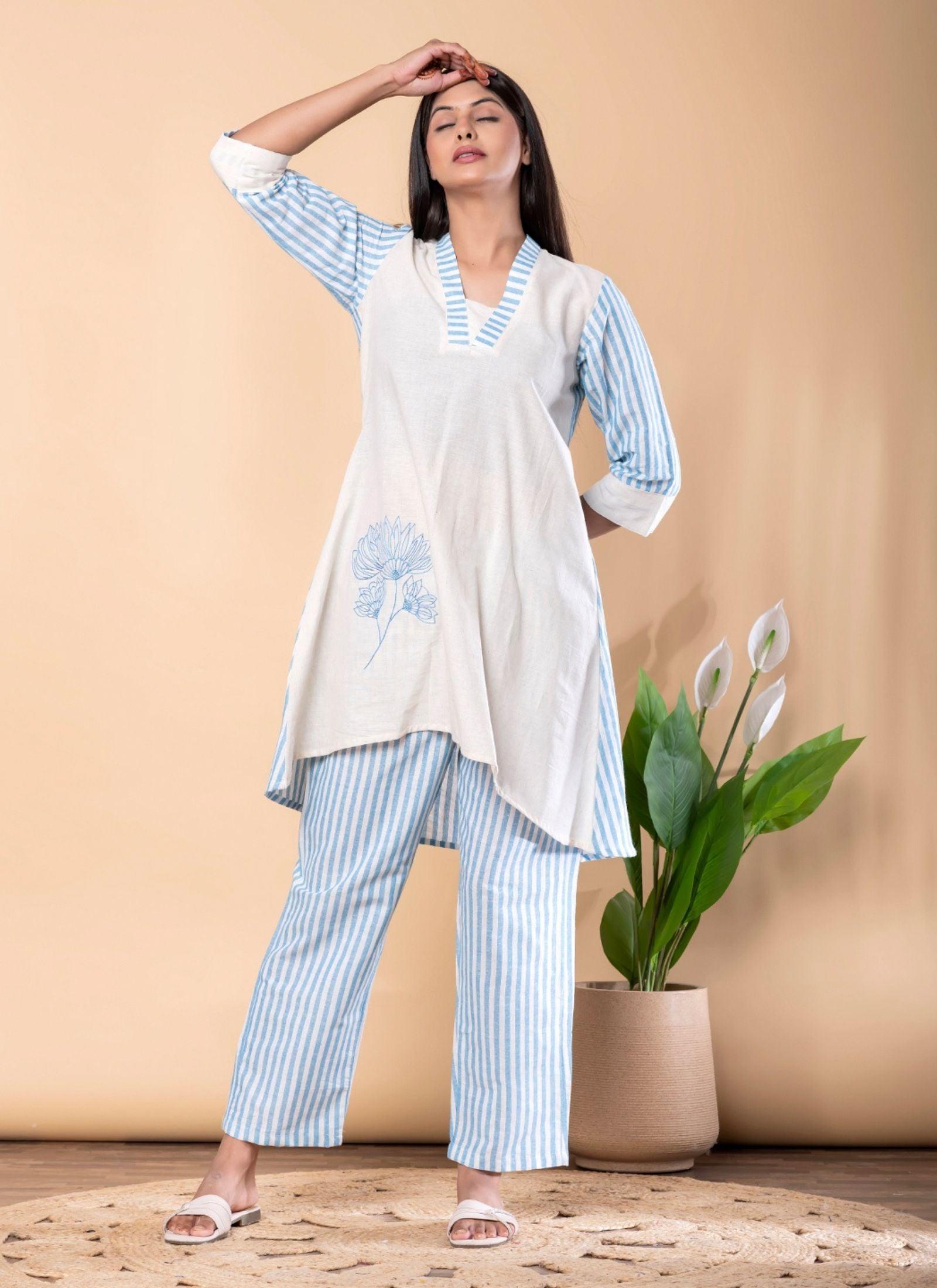 Women's Blue & Off-White Striped Print with Floral Embroidered Co-ord Set