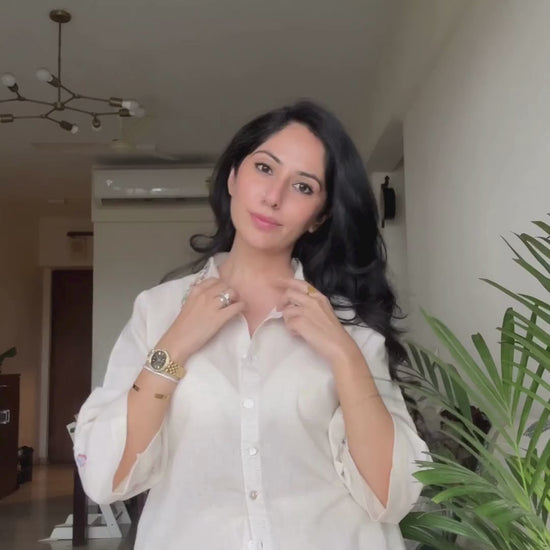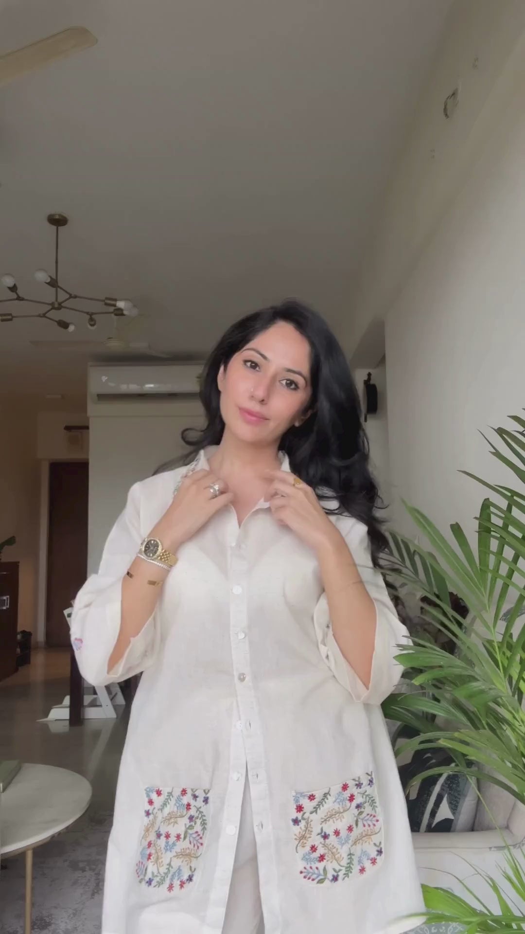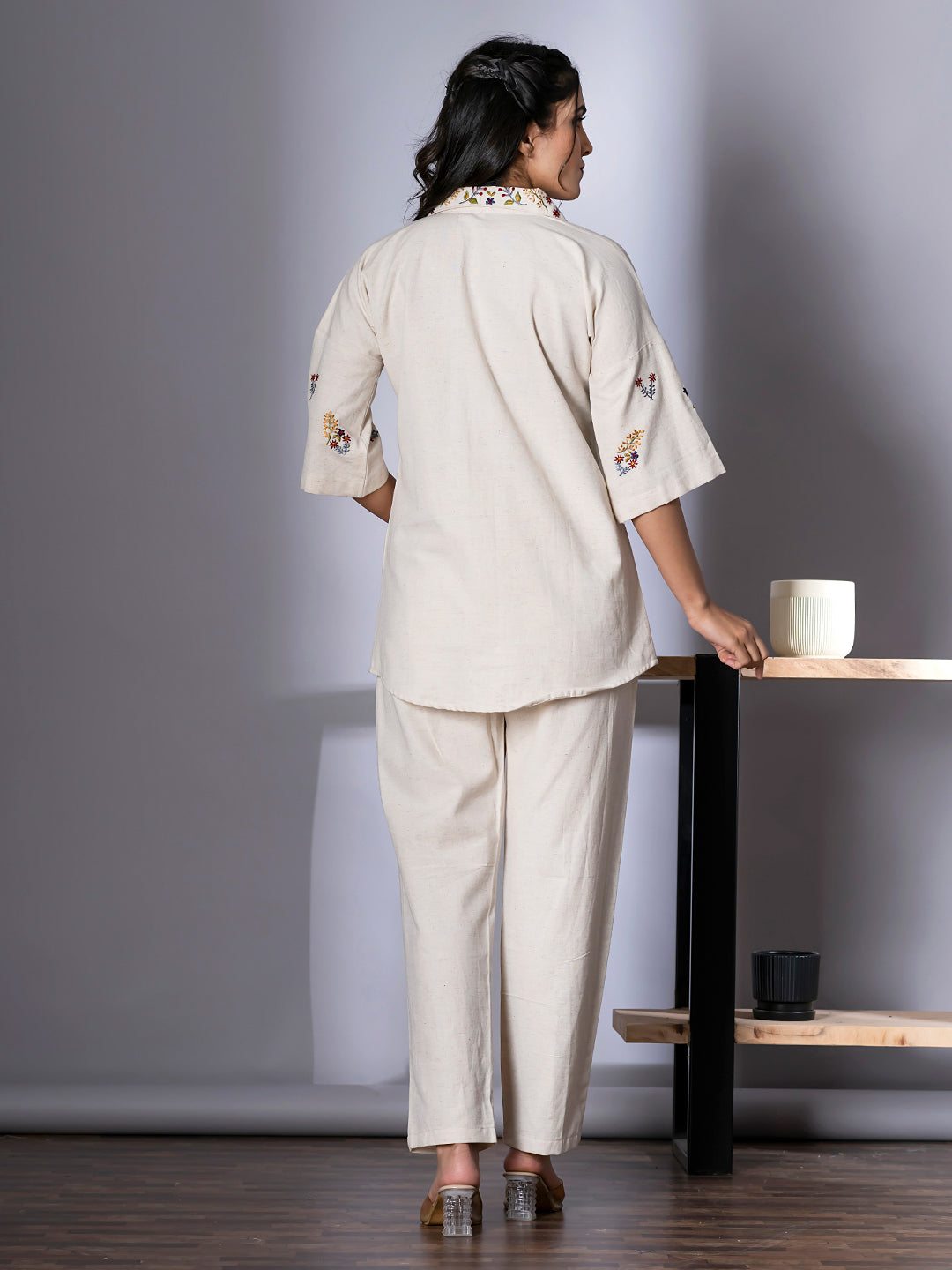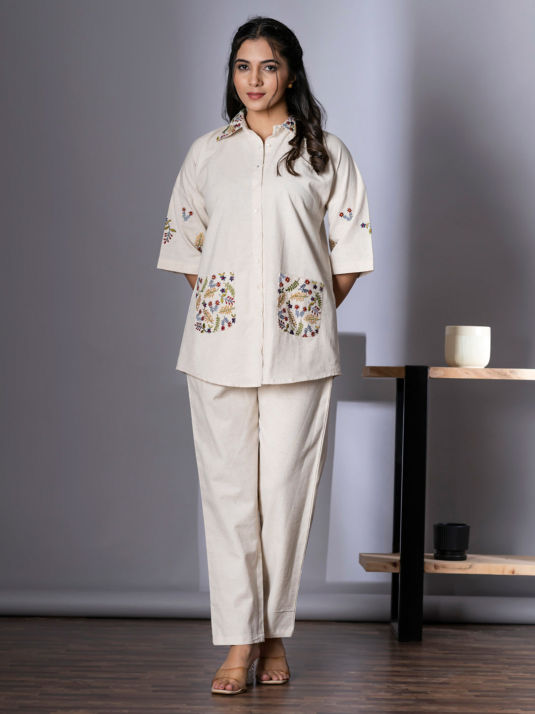 Women's Cream Pure Cotton Floral Embroidered Top and Pant Co-ord Set | Spread Collar Half Sleeves Embroidered Top and Elastic Waistband Closuer Plain Pant