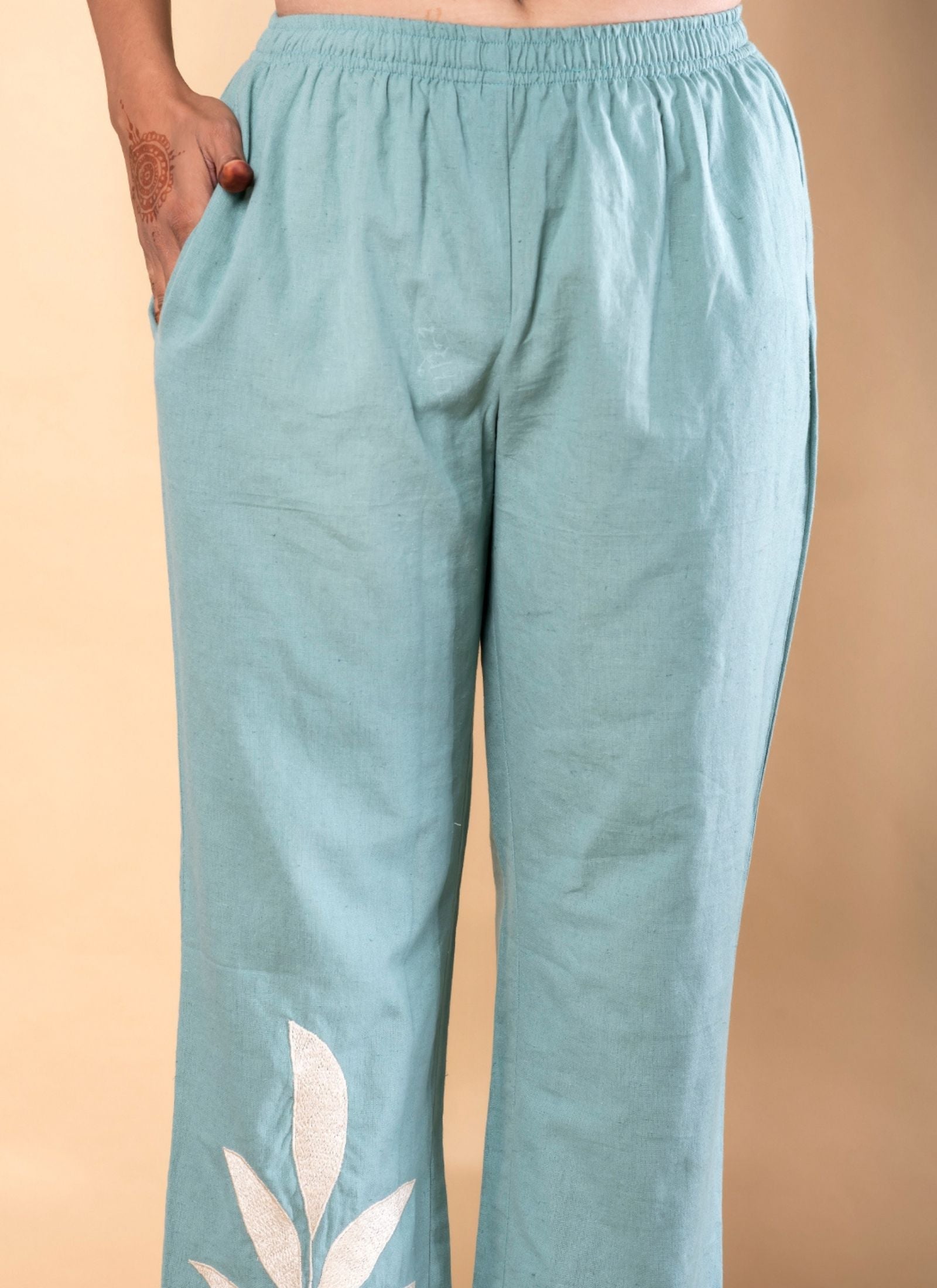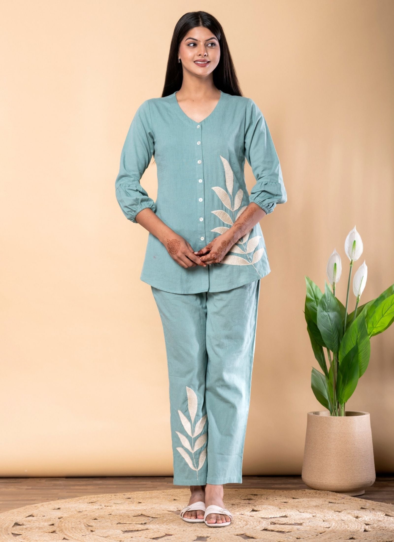 Women's Turquoise Blue Pure Cotton Floral Thread Embroidered Top and Pant Co-ord Set